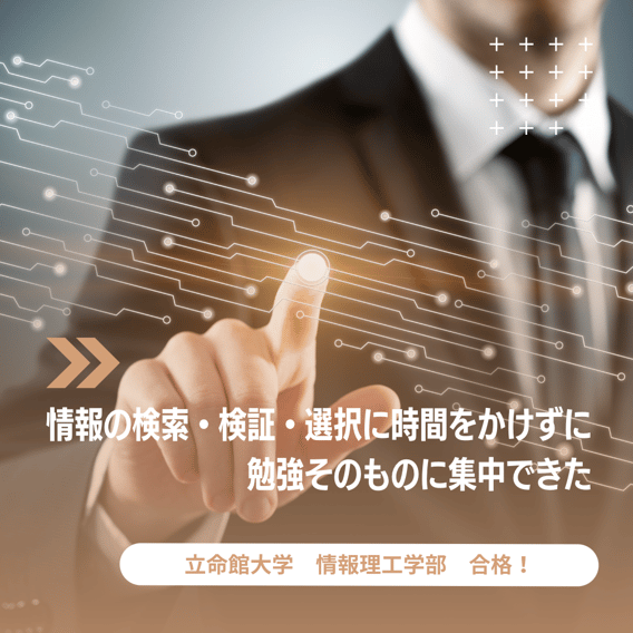 志望校や時期に合わせて参考書ルートを提示していただきました。以前はネットで情報を見つけて参考書や勉強法をコロコロ変えていましたが、情報を探す時間が減り勉強に充てることができました。また、参考書がルートになっていることでレベルがバラつくこともなく、一貫性のある勉強をすることができました。