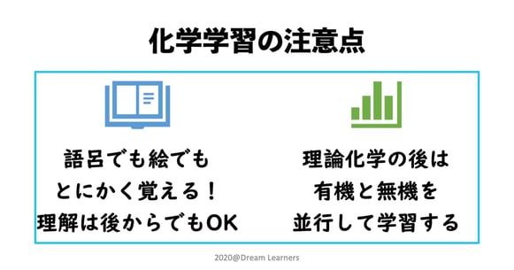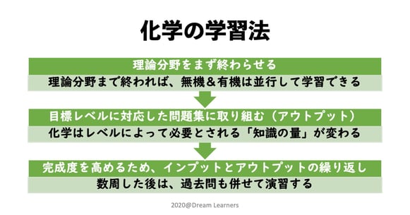 後述する様に、化学は「暗記する量が多い」ことが大前提ですから、学校の授業を全て終えてから復習を始める、というのは、試験で結果を出したい人にとっては、現実的ではありません。