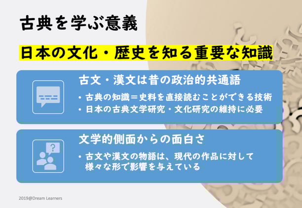 歴史博物館などを訪れた方にはわかると思いますが、昔の政治的な書類は、すべて古文の文体、あるいは漢文的な文体で書かれていました。日本の歴史を直接資料から知ることもできる大切な知識を学んでいるともいえます。