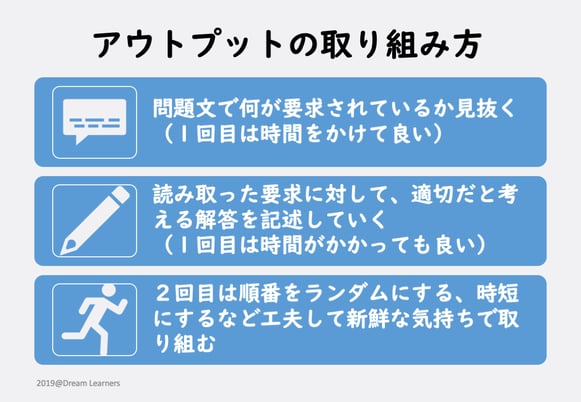 「ずっとインプットばかりしている」「ずっと問題演習ばかりしている」というのはやめましょう。それで適当に覚えているだけでは、本番で問題が解けるようにはなりません。